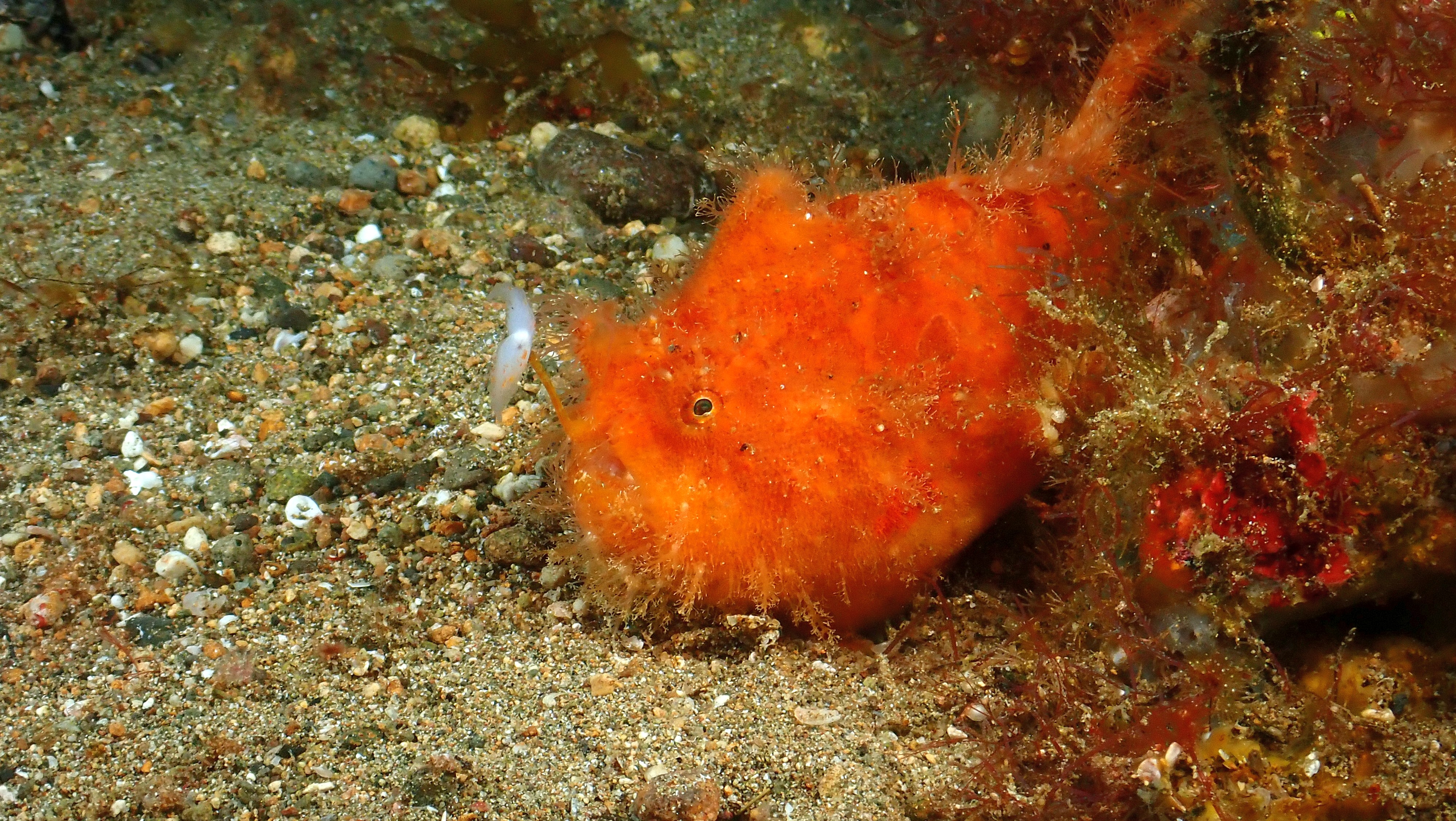 Heute haben wir 3 Tauchgänge unternommen. Der erste an einer Steilwand mit vielen Schnecken. Der zweite auf Sand war sehr schön. Unter anderen sahen wir einen Geisterpfeifenfisch, Seepferdchen und eine Flammenden Sepia. Der dritte war dann gleich vor dem Resort, mit dem Highlight eines haarigen Anglerfisches.
