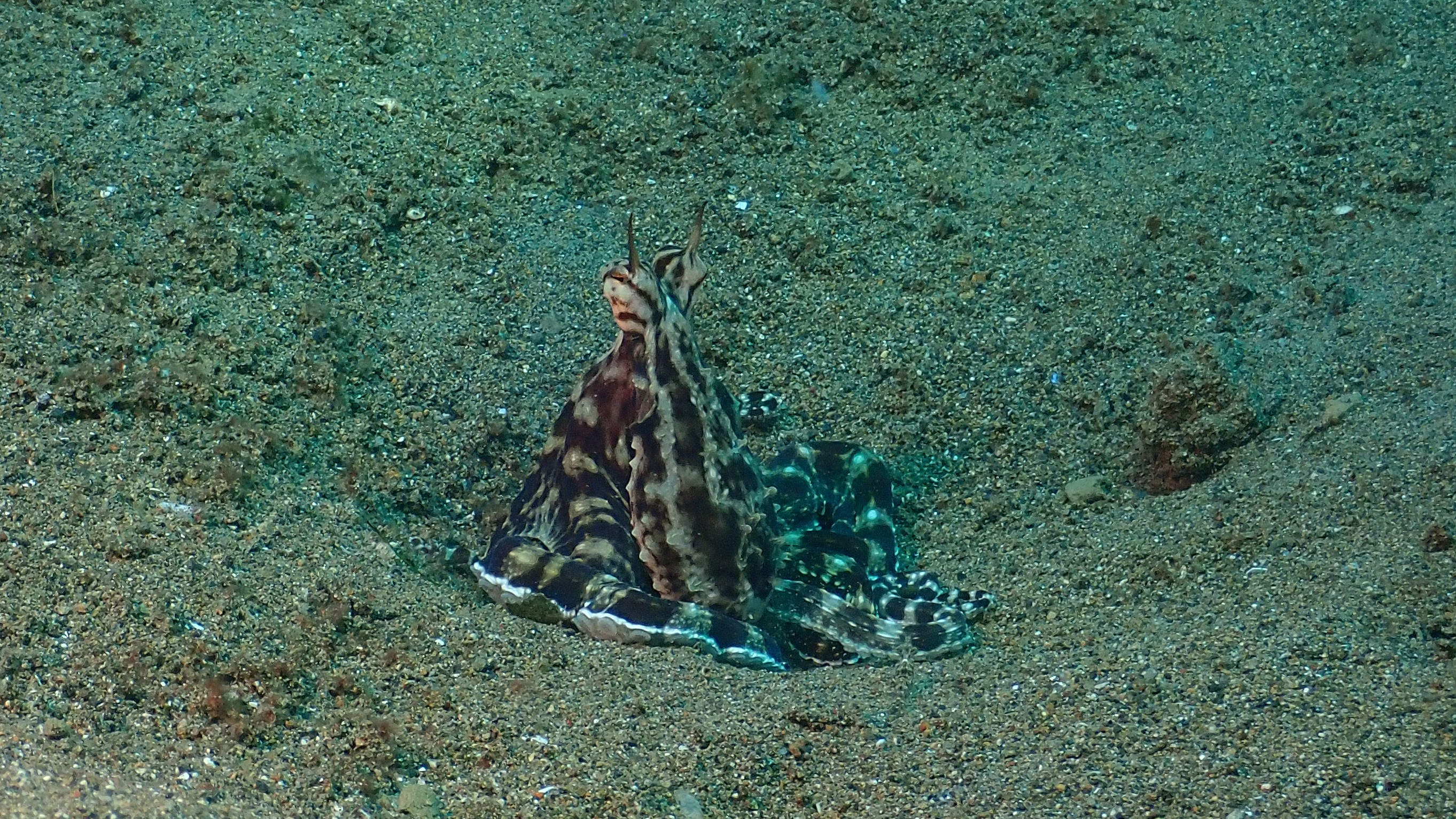 Heute konnten wir wieder 3 sehr schöne Tauchgänge unternehmen. Beim ersten über Sandboden waren besonders die Wandlungs- und Versteckmöglichkeiten des Langarm-Oktopus beeindruckend. Aber auch die flammende Sepia mit ihren tollen Farben auf Nahrungssuche hat mir gefallen. Der zweite Tauchplatz beeindruckte durch seine schönen Korallen, bunte Federsterne und den Fischreichtum. Am dritten Tauchplatz waren die grünen Anglerfische für mich das Highlight.