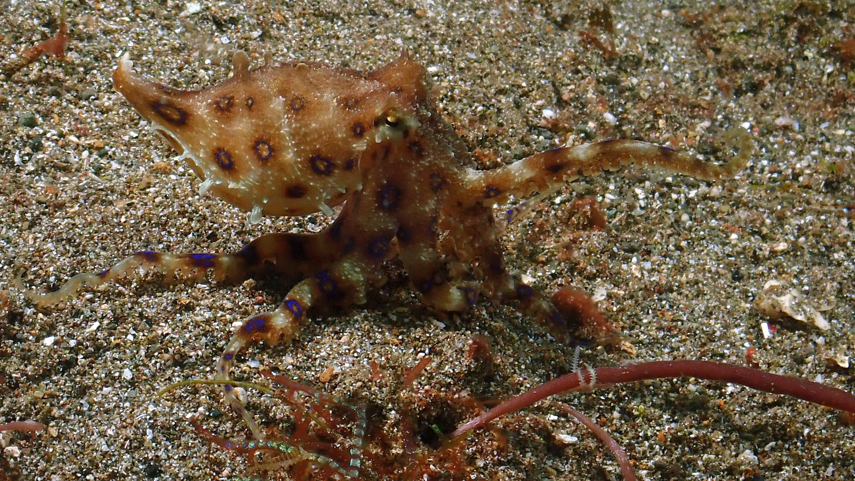 Nach dem Faulenzen gestern waren wir heute erst an einer schönen Steilwand mit vielen Hart und Weichkorallen. Beim zweiten Tauchgang haben wir dann einen schönen weißen Anglerfisch auf der Suche nach einem neuen Platz beobachtet. Das Highlight war dann aber neben dem farbenfrohen „Helm Flughahn“ der sehr giftige Blauring-Oktopus beim letzten Tauchgang.