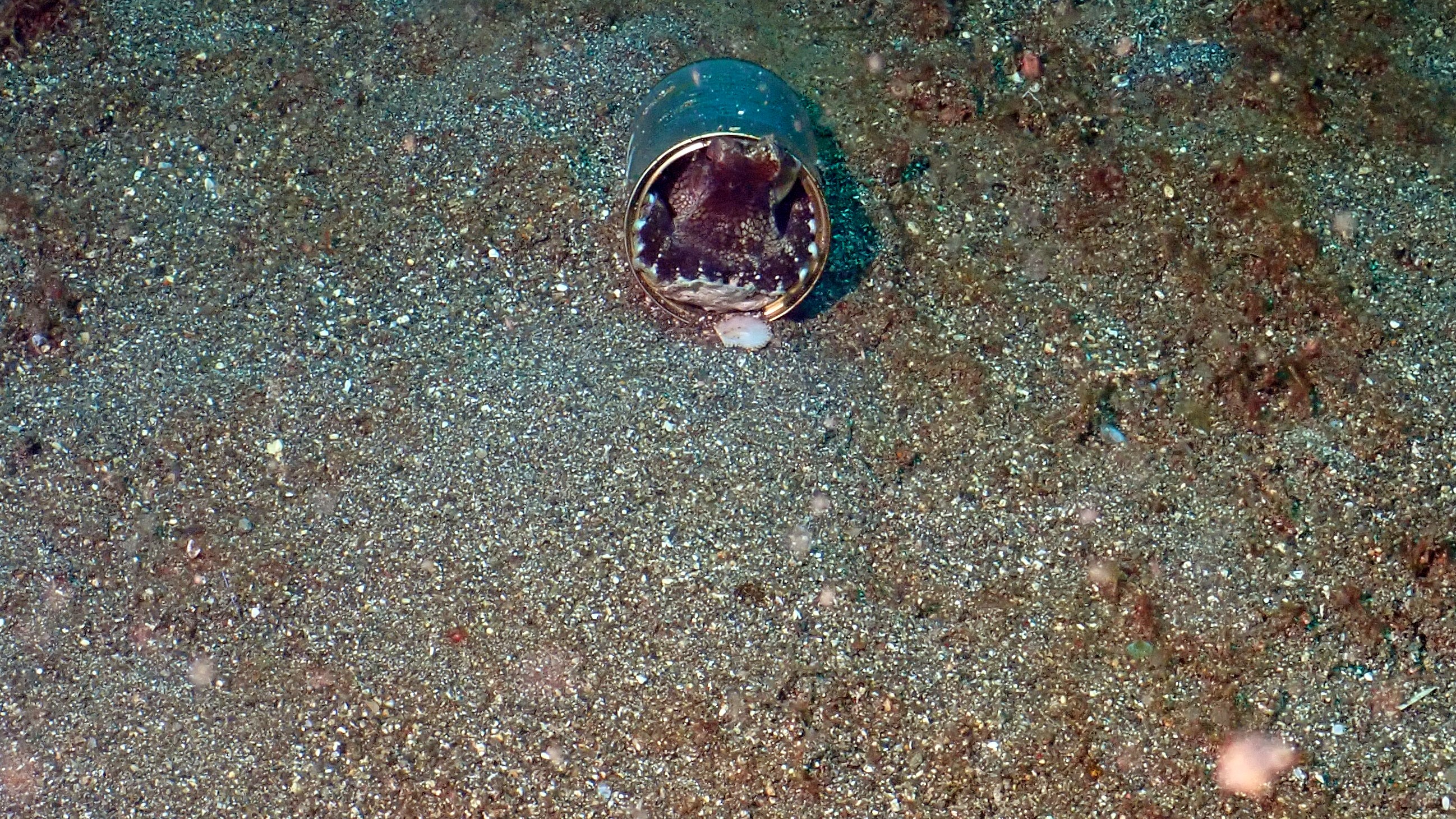Beim ersten Tauchgang haben wir neben Krabben und Garnelen auf Seesternen wieder einen roten Anglerfisch gesehen. Während des austauchens kam dann ein Sandaal herausgekrochen. Beim zweiten Tauchgang waren die Highlights eine "Orang-Utan-Krabbe" auf dem Sand, 2 "Schmuck Geisterpfeifenfische" vor einem Federstern und vor allem die "Flammende Sepia".