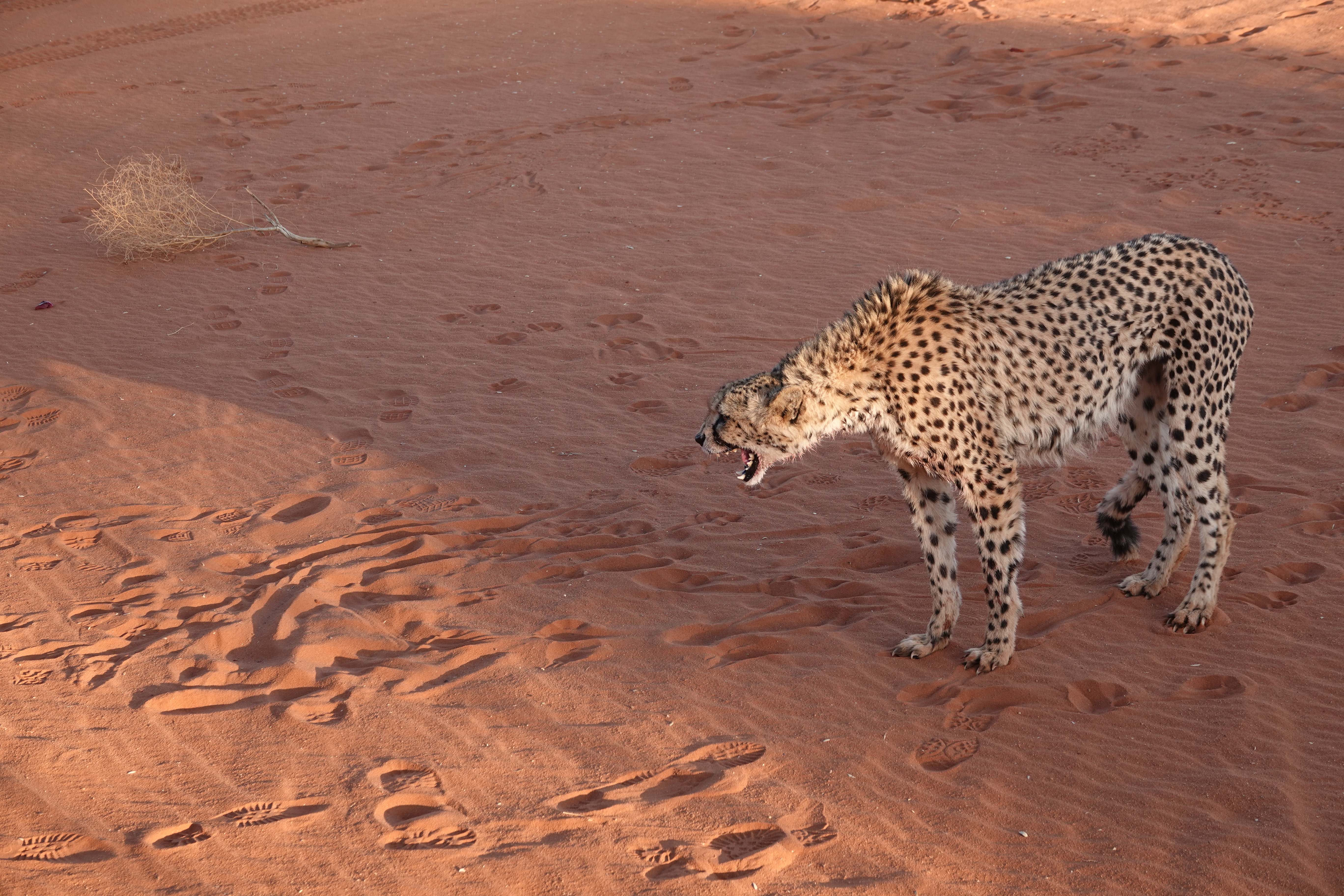 Das absolute Highlight war jedoch die Gepardenfütterung. Die Bagatelle Lodge kümmert sich um junge Geparden, die verwaist sind und ohne Hilfe nicht überlebt hätten. Es war faszinierend zu sehen, wie die Geparden dem Rangerjeep hinterherjagten, um ihre Mahlzeit zu erhalten.