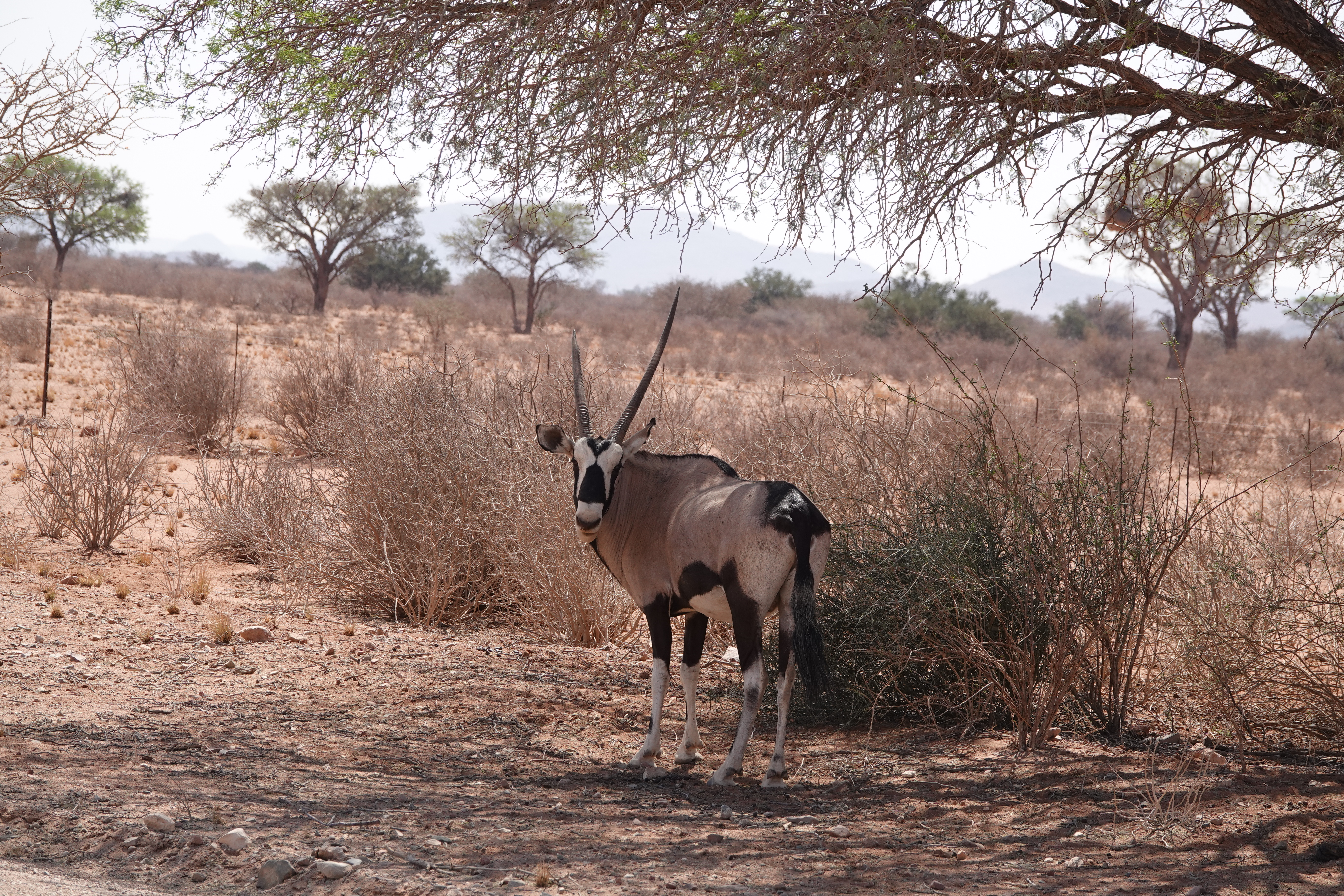 Am Morgen ließen wir es etwas ruhiger angehen und starteten unsere Fahrt in Richtung Sossusvlei erst gegen 10:00 Uhr. Unser Ziel war das Le Mirage Resort & Spa (https://www.mirage-lodge.com/de/), eine eindrucksvolle Oase mitten in der Wüste. Unterwegs legten wir einen kurzen Tankstopp ein und entdeckten in der Nähe der Straße eine majestätische Oryxantilope.