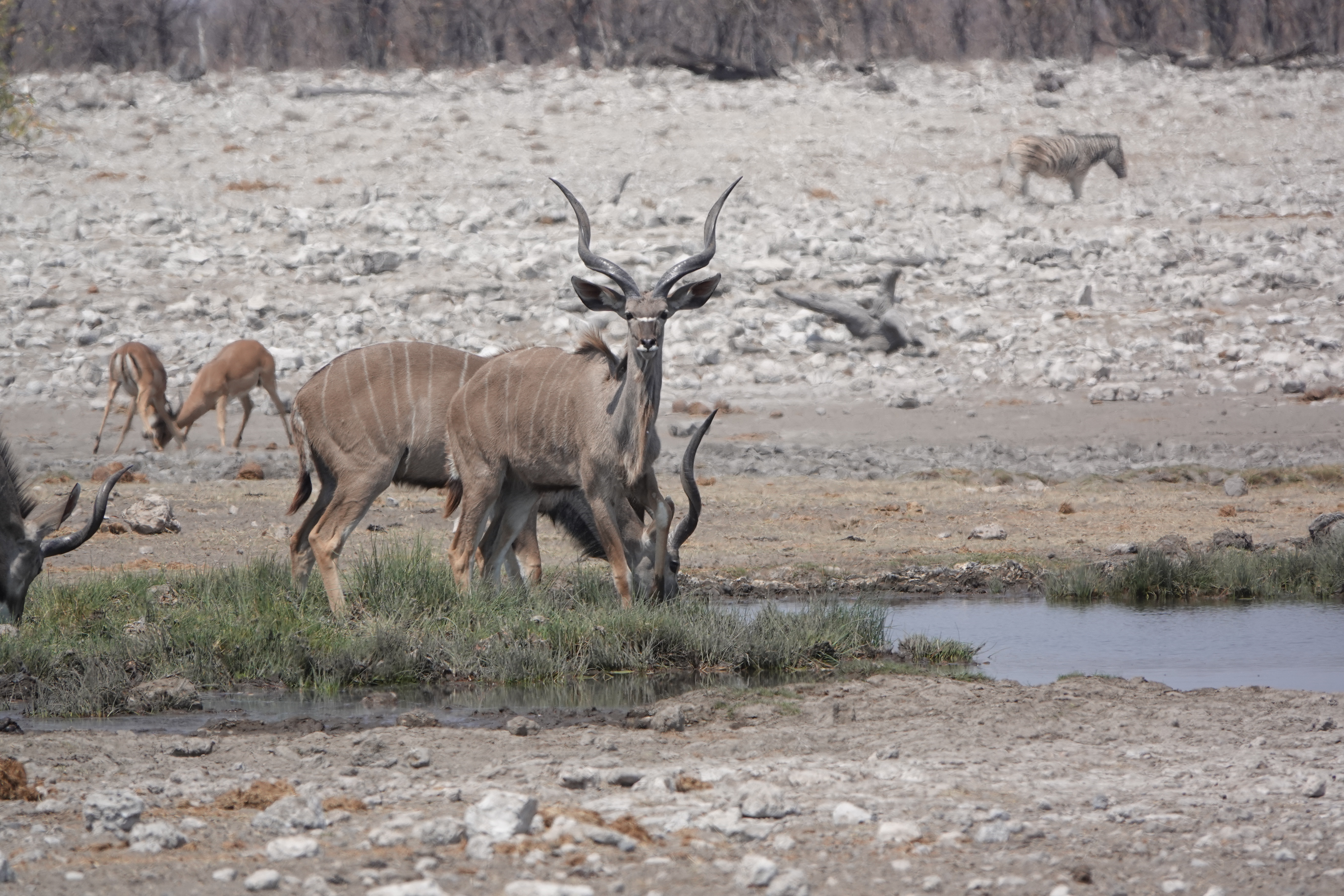 Da unsere heutige Übernachtung im nördlichen Teil des Etosha Nationalparks, im Onguma Bush Camp (https://onguma.com/de/onguma-bush-camp-ger/), lag, nutzten wir die Gelegenheit, den Park noch einmal ausgiebig zu erkunden. Wir fuhren entlang der Etosha-Pfanne und machten immer wieder Halt an verschiedenen Wasserlöchern, um die faszinierende Tierwelt zu beobachten.