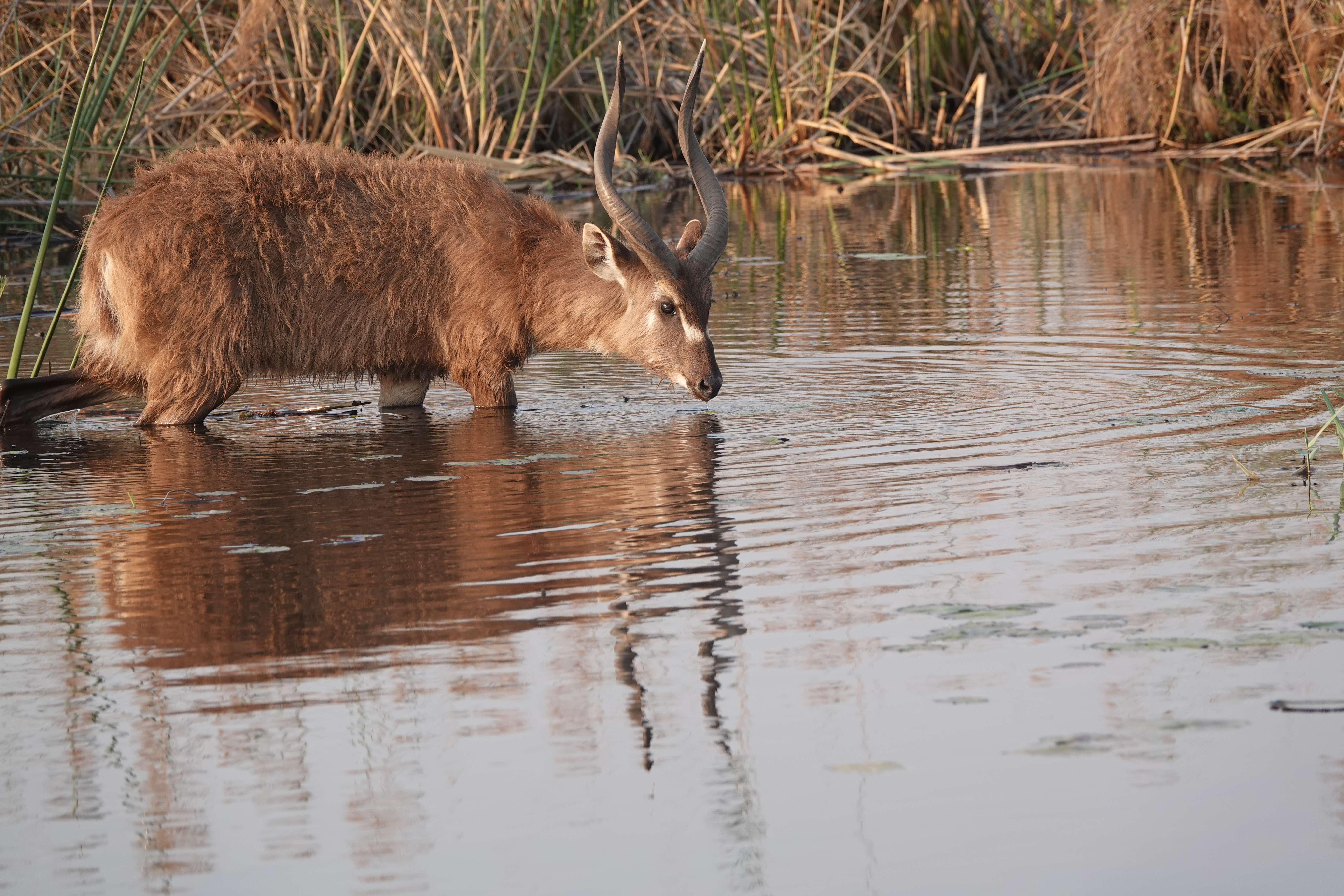 Am Abend unternahmen wir eine Bootsfahrt auf dem Kwando, bei der wir Krokodile und Flusspferde aus nächster Nähe beobachten konnten. Den Tag ließen wir mit einem Sundowner direkt am Fluss, in der Nähe der Nilpferde, entspannt ausklingen.