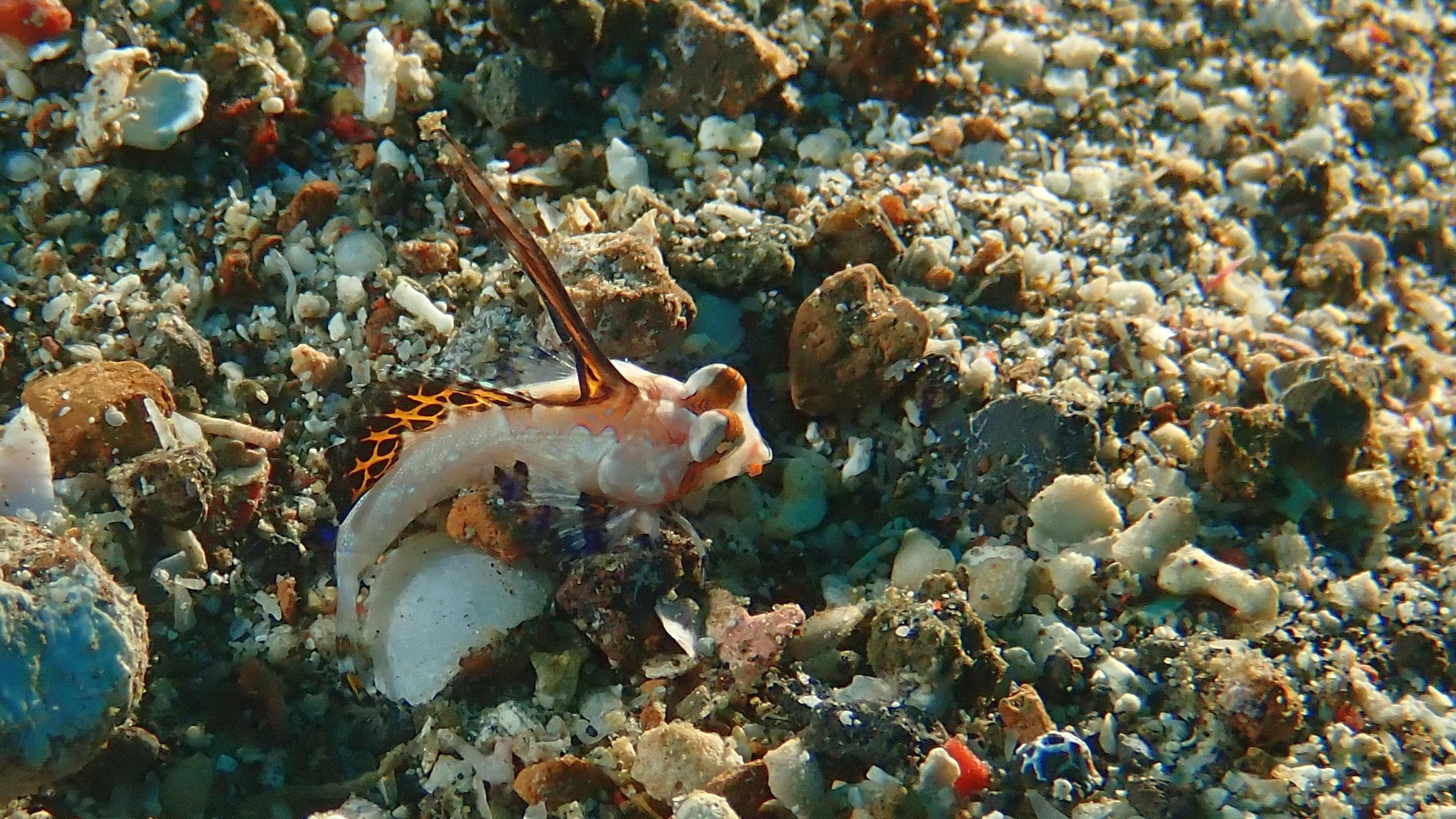 Heute unternahmen wir zwei weitere Tauchgänge im dunklen Sand von Lembeh – wieder ganz auf der Suche nach den berühmten „Crittern“. Schon nach kurzer Zeit zeigte sich, wie vielfältig dieses Revier ist: Der Walkman und der Finger-Leierfisch präsentierten sich diesmal in ganz anderen Farben als am Vortag, und auch die Nacktschnecken zeigten neue, faszinierende Varianten. Besonders beeindruckend waren jedoch die vielen Anglerfische – in Schwarz, Weiß, leuchtendem Gelb, Orange und Rot. Eine wahre Farbenexplosion auf dunklem Grund! Das absolute Highlight waren drei „haarige“ Anglerfische in Weiß, Braun und Orange – außergewöhnlich schön und einfach faszinierend.