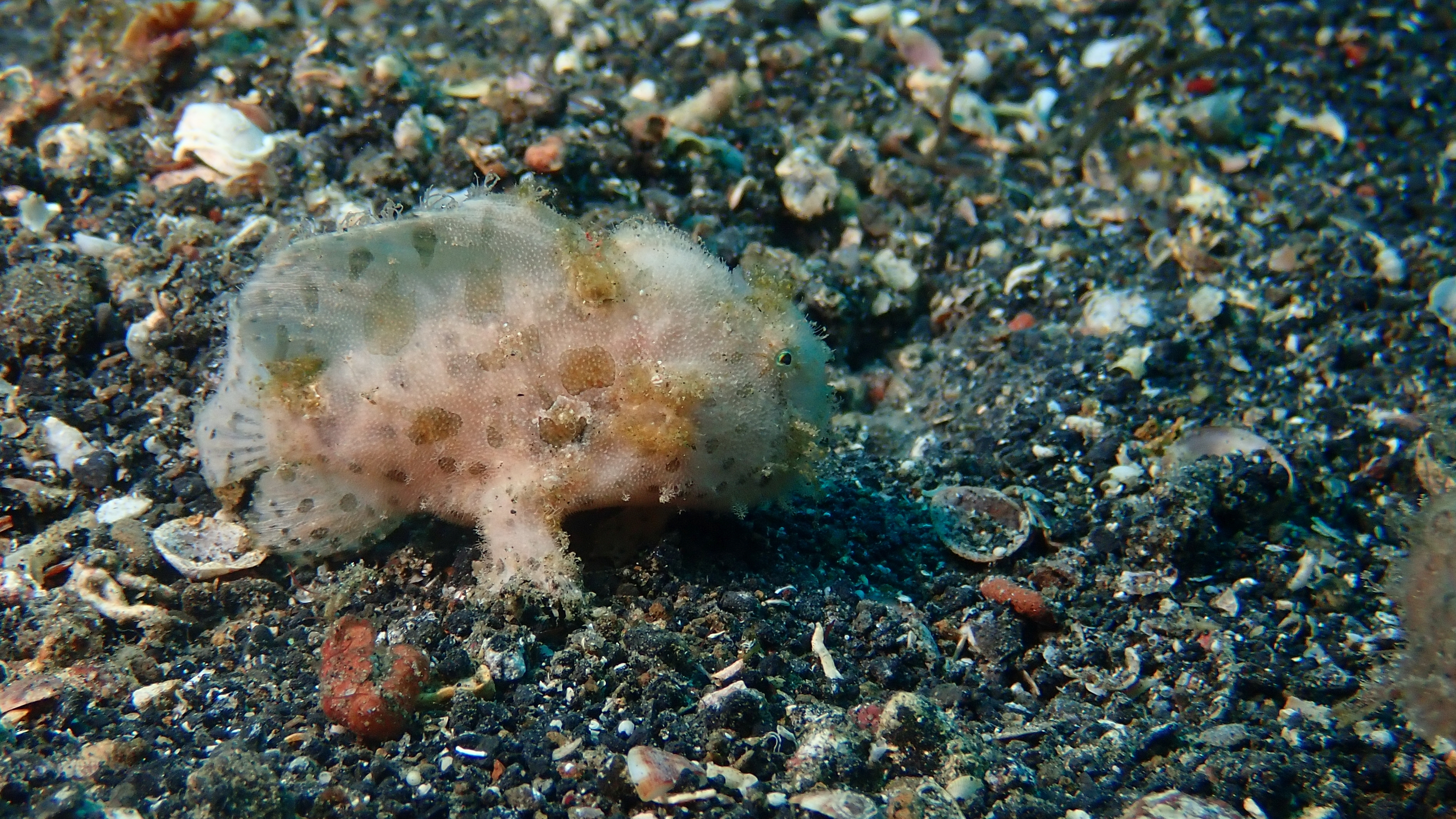 Heute unternahmen wir zwei weitere Tauchgänge im dunklen Sand von Lembeh – wieder ganz auf der Suche nach den berühmten „Crittern“. Schon nach kurzer Zeit zeigte sich, wie vielfältig dieses Revier ist: Der Walkman und der Finger-Leierfisch präsentierten sich diesmal in ganz anderen Farben als am Vortag, und auch die Nacktschnecken zeigten neue, faszinierende Varianten. Besonders beeindruckend waren jedoch die vielen Anglerfische – in Schwarz, Weiß, leuchtendem Gelb, Orange und Rot. Eine wahre Farbenexplosion auf dunklem Grund! Das absolute Highlight waren drei „haarige“ Anglerfische in Weiß, Braun und Orange – außergewöhnlich schön und einfach faszinierend.