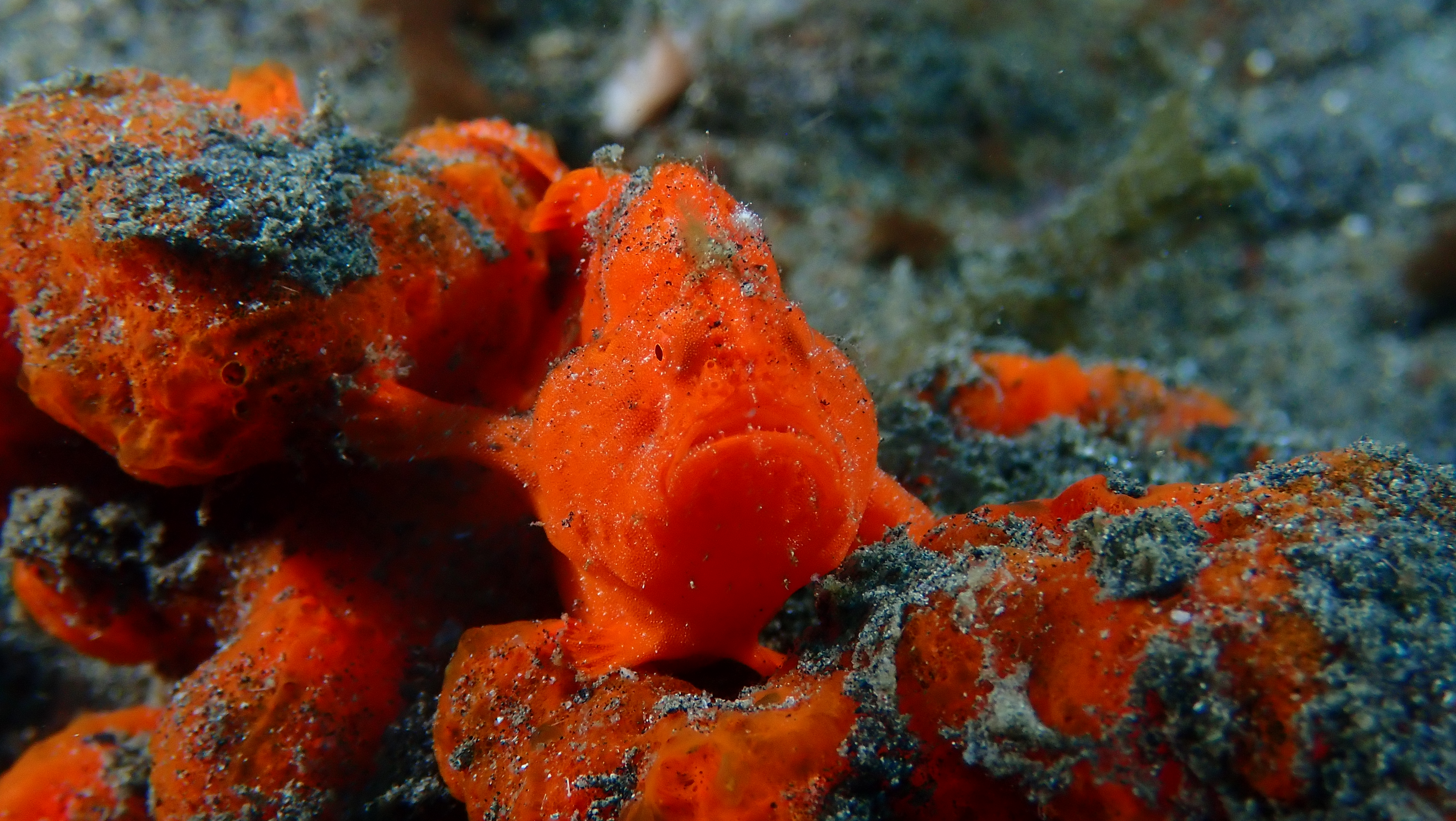Heute unternahmen wir zwei weitere Tauchgänge im dunklen Sand von Lembeh – wieder ganz auf der Suche nach den berühmten „Crittern“. Schon nach kurzer Zeit zeigte sich, wie vielfältig dieses Revier ist: Der Walkman und der Finger-Leierfisch präsentierten sich diesmal in ganz anderen Farben als am Vortag, und auch die Nacktschnecken zeigten neue, faszinierende Varianten. Besonders beeindruckend waren jedoch die vielen Anglerfische – in Schwarz, Weiß, leuchtendem Gelb, Orange und Rot. Eine wahre Farbenexplosion auf dunklem Grund! Das absolute Highlight waren drei „haarige“ Anglerfische in Weiß, Braun und Orange – außergewöhnlich schön und einfach faszinierend.