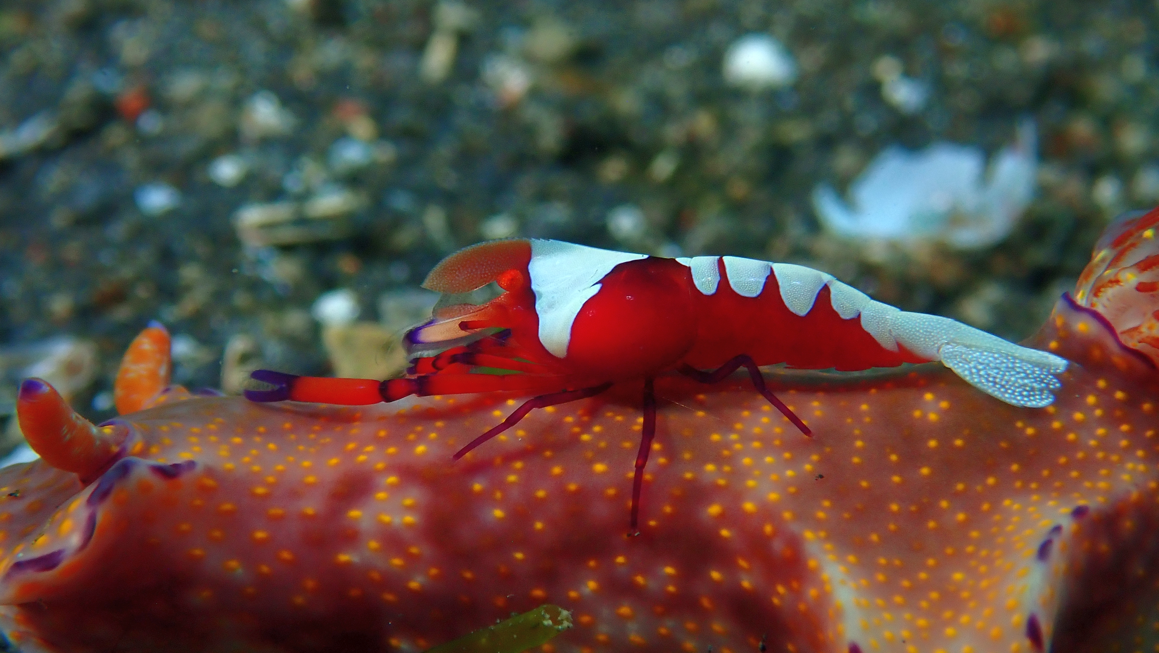 Ein besonderer Hingucker war eine Imperatorgarnele, die wie ein winziger Jockey auf einer Schnecke „ritt“. Zum Schluss tauchte sogar eine Flamboyant-Sepia auf. Leider war genau in diesem Moment der Akku meiner Kamera fast leer, sodass ich nur noch Fotos machen, aber keinen Film mehr aufnehmen konnte.